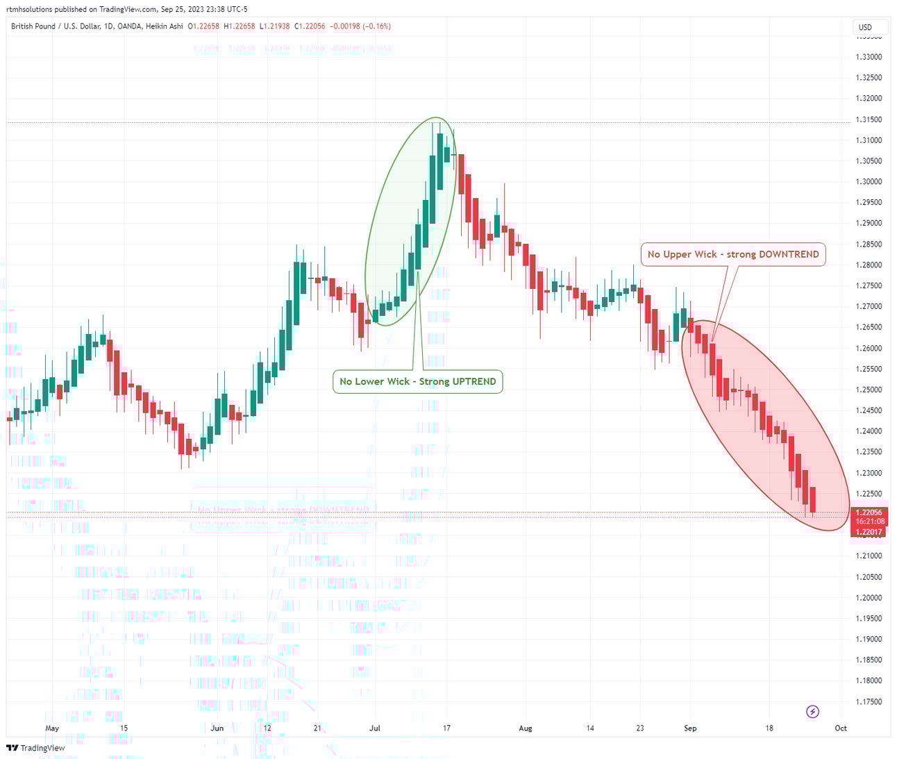 If you observe red candles with no upper wicks, it indicates a strong downtrend.
