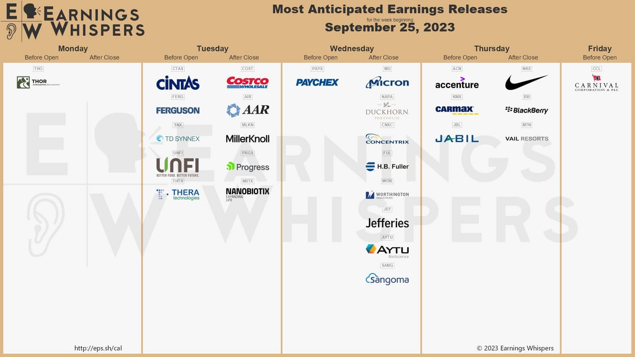 This is another light week for earnings. The most notable earnings for the week (September 25 - September 29) include Costco (Nasdaq: COST), Micron Technology (Nasdaq: MU), and Nike (NYSE: NKE).