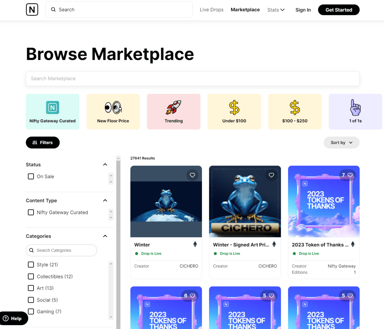 Nifty Gateway offers a curated marketplace to buy, sell, and store digital art and collectible Nifties or NFTs. With its user-friendly design, it simplifies NFT trading by categorizing them and allowing fiat currency purchases. It boasts exclusive NFT drops and a robust security system, courtesy of its owner, Gemini.