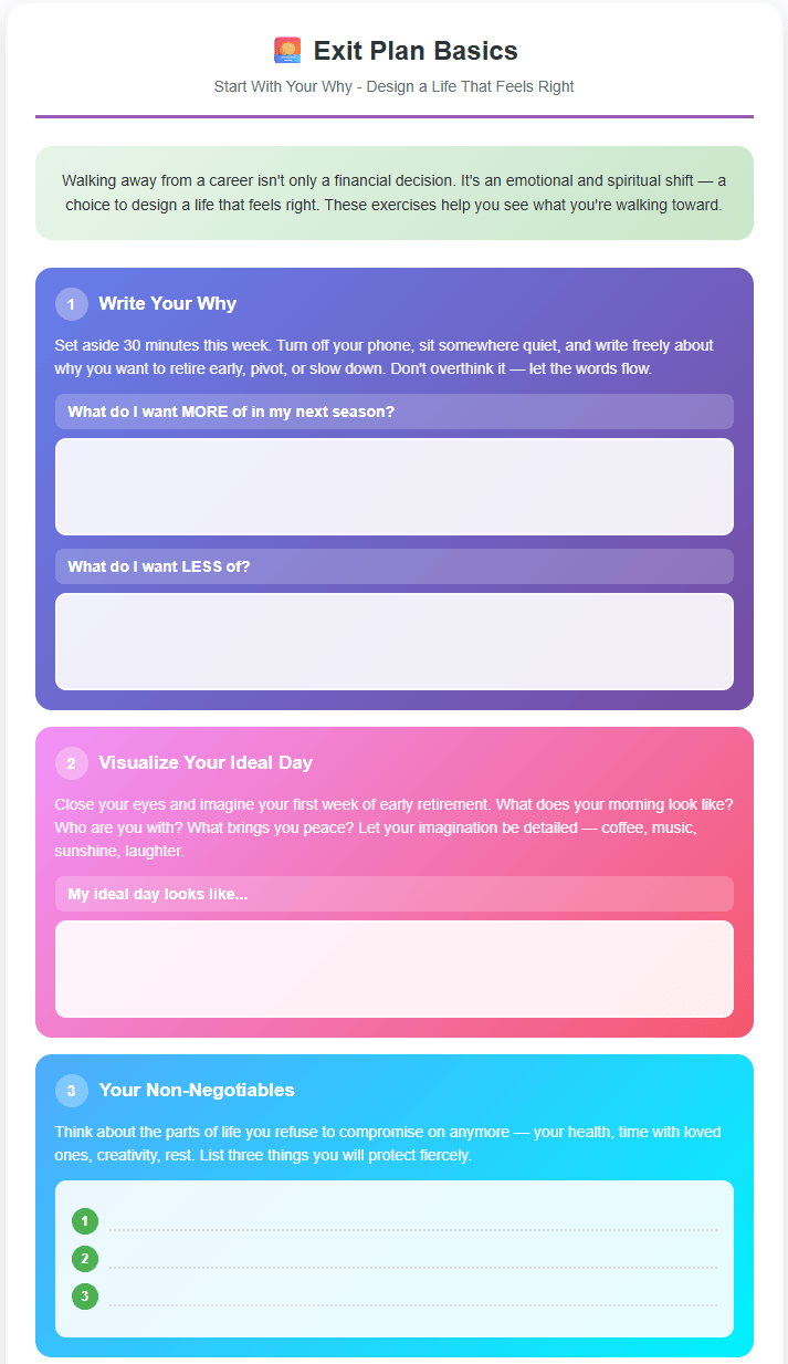 What most people don’t tell you is that early retirement or a career pivot is all about design first. It’s about envisioning a life that makes sense for you. For some, that means part-time consulting. For others, it means a small business or even taking a long pause to heal before deciding what’s next. There’s no single right path, but there is one right starting point, your vision (and yours alone).