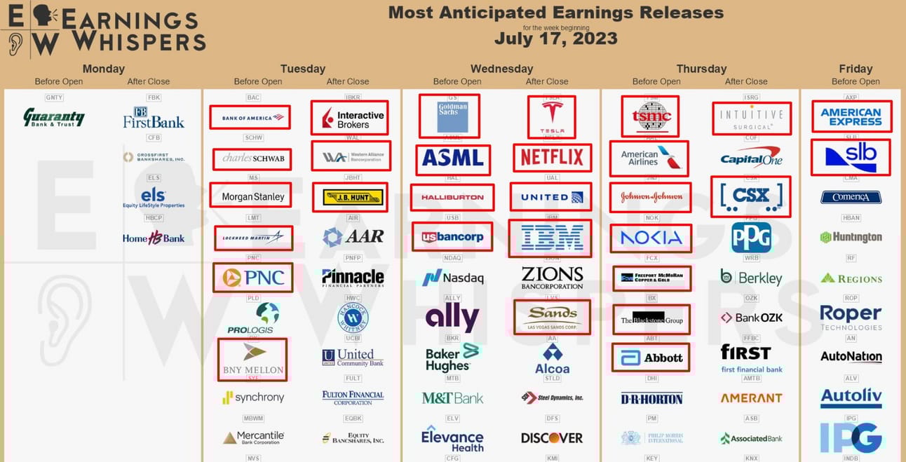 Earnings season continues this week with Tesla (TSLA) and Netflix (NFLX) among the major companies reporting. The most notable earnings for the week (July 17 - 21, 2023) are outlined in red in the chart below.