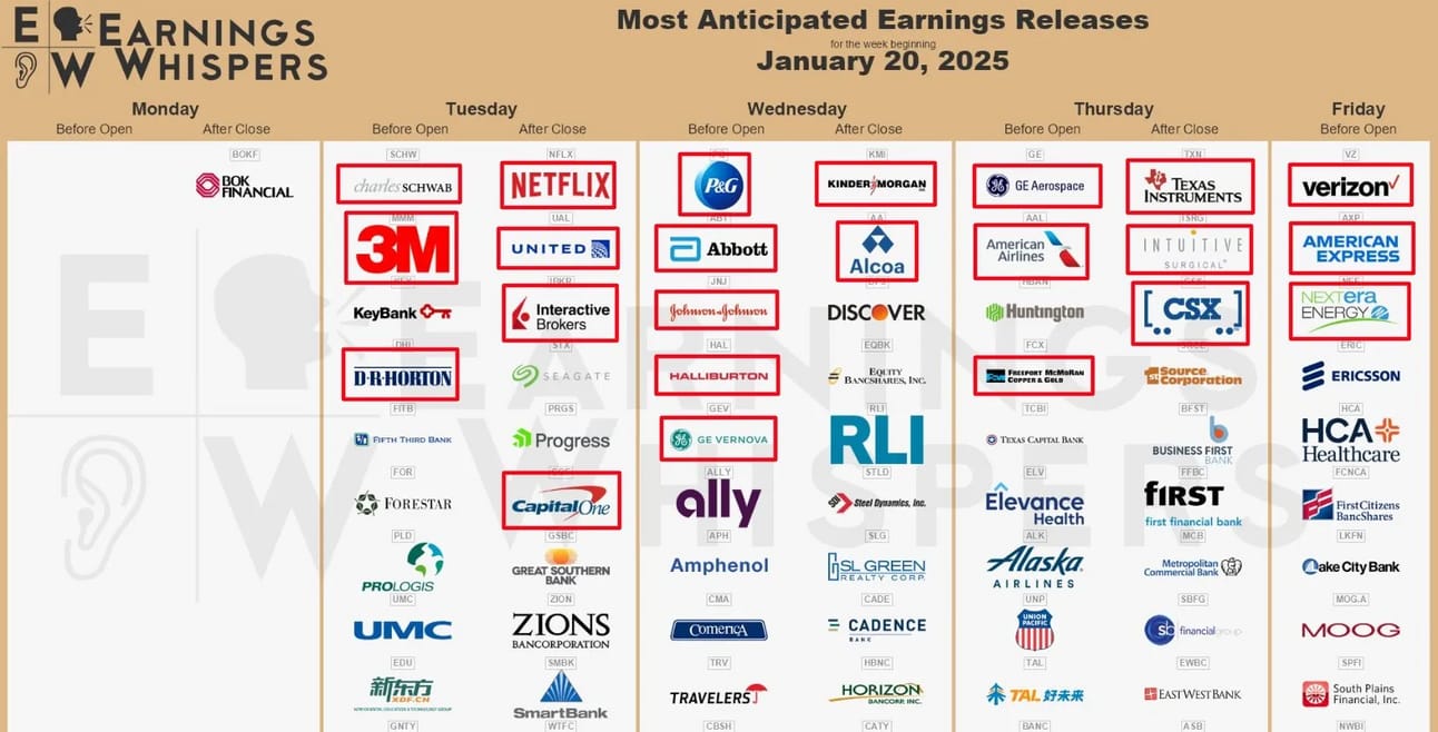 Earnings: Netflix ($NFLX) kicked off this week earnings with a bang and is now trading at all-time highs thanks to a stellar earnings report. Other key companies reporting this week (outlined in red below) include tech giants, major financial institutions, and consumer discretionary firms.