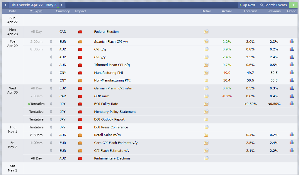 No Fed speeches this week as Fed enters a blackout ahead of May 6-7 FOMC meeting.