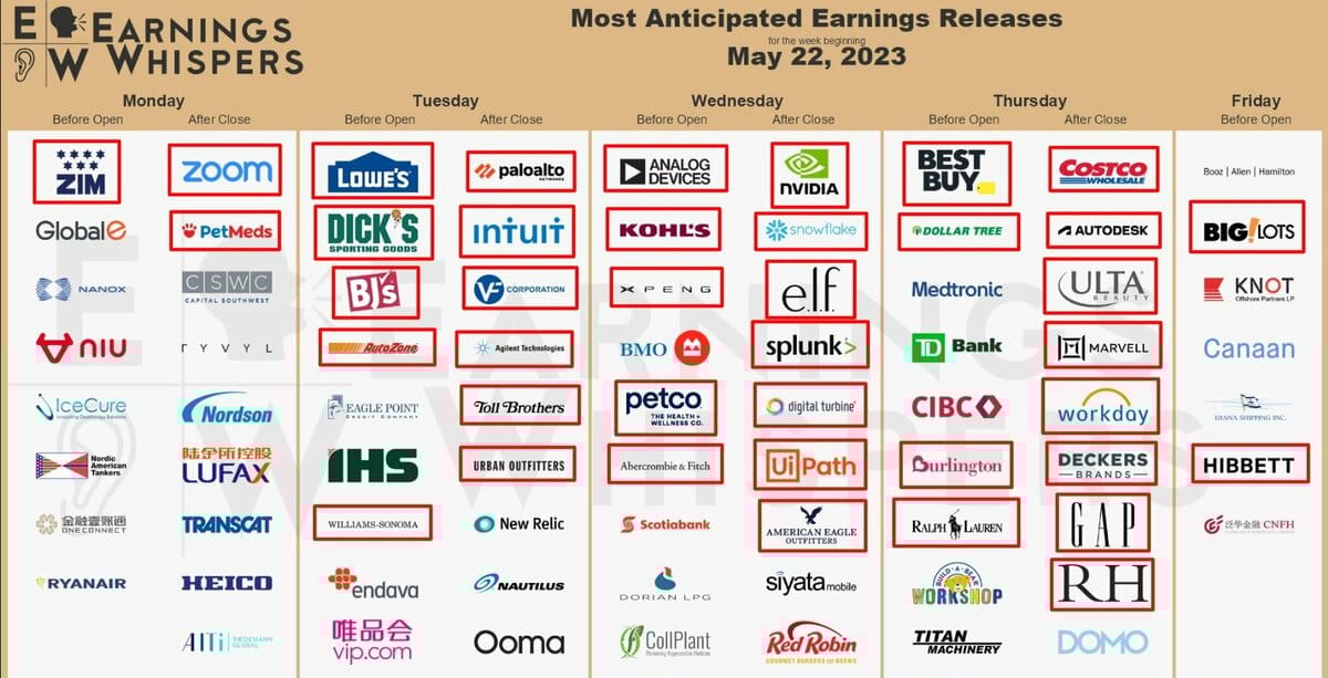 This week's earnings releases are shown in the chart below. Most notable companies are outlined in red.