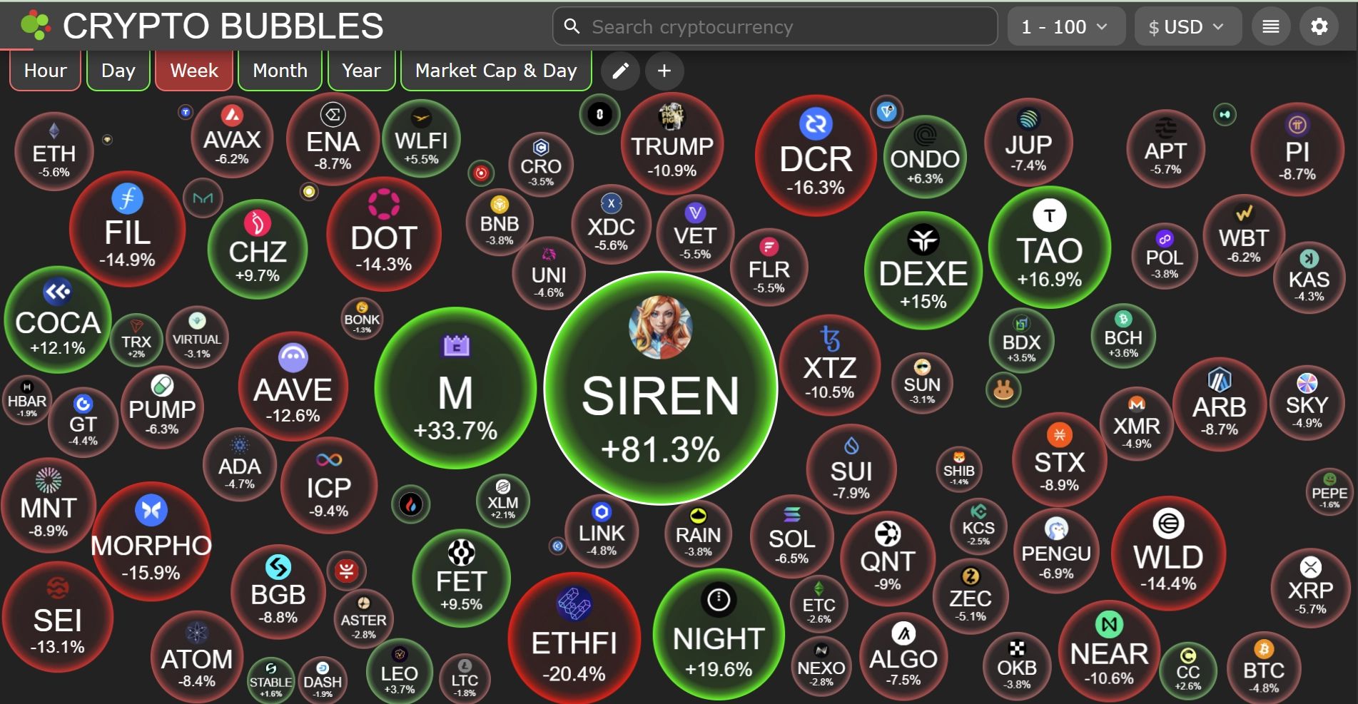 Top crypto gainers (last week): SIREN, M, NIGHT, TAO, DEXE