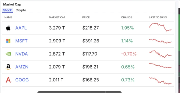 The Market Cap module lists the top U.S. companies by valuation (Apple, Microsoft, NVIDIA, Amazon, and Google) along with their current prices, daily percentage change, and short-term price trend. I find the 30-day chart preview next to each company very helpful.