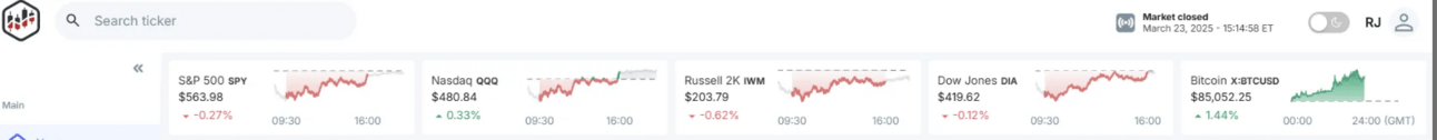 S&P 500, Nasdaq, Russell 2000, Dow Jones, and Bitcoin. These mini-charts provide a visual representation of intraday movement, allowing users to quickly assess market sentiment (bullish or bearish/ green or red) and directional bias (is the market trending up, down, or sideways).