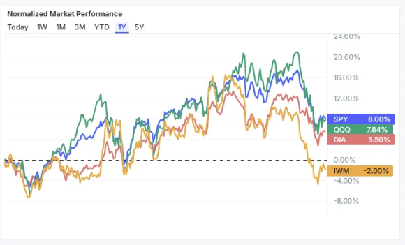 The Normalized Market Performance chart compares major indices over multiple timeframes, from one day to five years. It tracks ETFs like SPY (S&P 500), QQQ (Nasdaq-100), DIA (Dow), and IWM (Russell 2000).