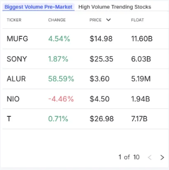The Biggest Volume Pre-Market section highlights stocks experiencing unusual volume before opening bell. This is a data-driven starting point for identifying liquidity, sentiment shifts, and potential trade candidates.