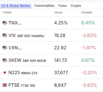 Positioned on the lower left, the macro section presents real-time data on U.S. Treasury yields (TNX), volatility indices (VIX, VXN, SKEW), and key global indices (e.g., Nikkei, FTSE).