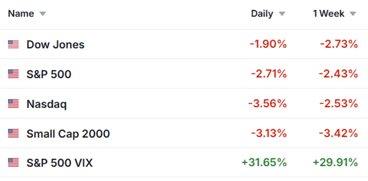 Major indices traded lower for the first full week of October as renewed trade tensions dominated sentiment. Early optimism faded after President Trump said there was “no reason” to meet with China’s President Xi following new Chinese export controls on rare earth minerals. The CBOE Volatility Index (VIX) spiked above 21, signaling a sharp shift in market mood.
