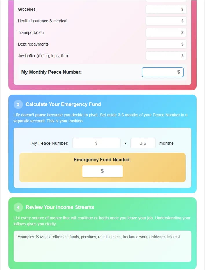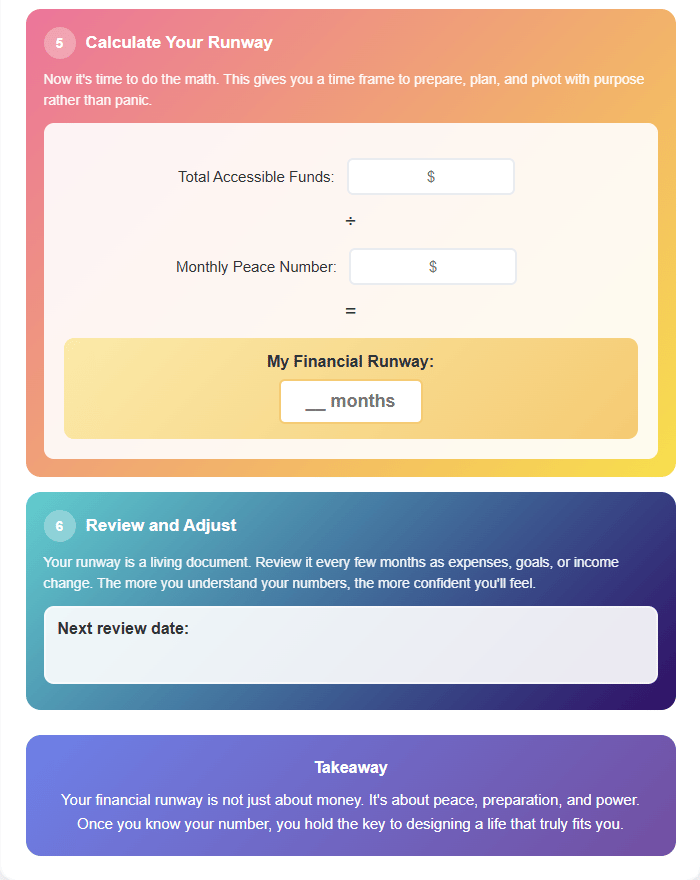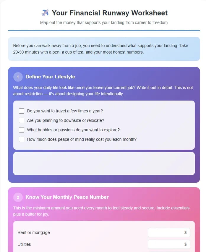 In this week’s Special Tools and Strategies section, you’ll find the “Financial Runway Worksheet.” It will walk you through the same process I used to plan my exit: calculating your monthly peace number, mapping your resources, and identifying the gaps to fill before you take the leap (retirement or career change or life change).