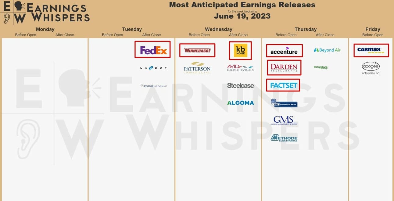 Earnings releases are very light this week. The most notable companies are outlined in red in the chart below.